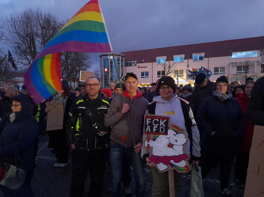 Leider gab es auch ein paar Vorfälle, die ich euch nicht verschweigen möchte. Bei dem Bürgerdialog der AFD, wo wir bereits Flagge gezeigt haben, sowie am Dienstag bei der Kundgebung gegen die AFD, wurden wir mehrmals Opfer von queerfeindlichen Angriffen. Sowohl auf dem Hinweg als auch auf dem Rückweg zu den beiden Veranstaltungen wurden wir von unterschiedlichen Personen beleidigt, nur weil wir mit Regenbogenfahnen auf den Straßen waren. Wörter wie "F*** LGBT" oder "H*** Söhne" wurden uns entgegengerufen. Nach Überlegungen werde ich das nicht auf uns sitzen lassen und werde Anzeige erstatten.