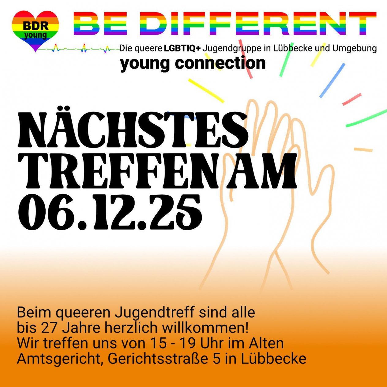 Die Gruppe von Be Different trifft sich jeden 1. und 3. Mittwoch eines Monats zwischen 17°° Uhr und 21°° Uhr in den Räumlichkeiten des Alten Amtsgericht in Lübbecke, die uns freundlicherweise von der Stadt Lübbecke zur Verfügung gestellt werden.