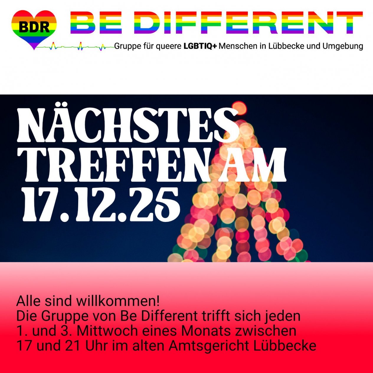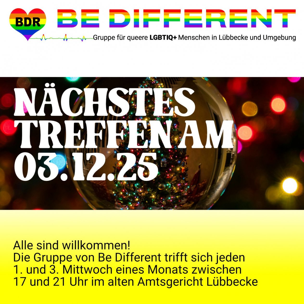 Die Gruppe von Be Different trifft sich jeden 1. und 3. Mittwoch eines Monats zwischen 17°° Uhr und 21°° Uhr in den Räumlichkeiten des Alten Amtsgericht in Lübbecke, die uns freundlicherweise von der Stadt Lübbecke zur Verfügung gestellt werden.